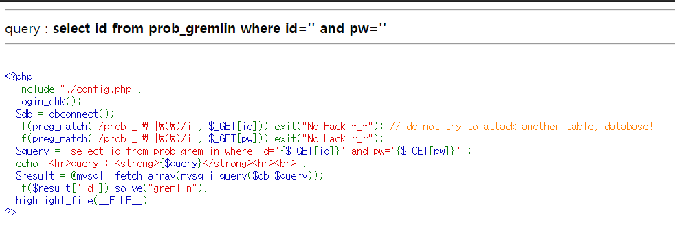 기본적인 database 를 어택할 수 있는 키워드들은 막아놓은 상태이고, 파라미터로 id와 pw를 GET방식으로 입력받아